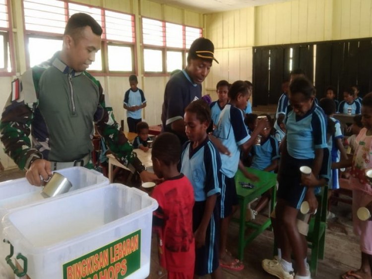 Kegiatan yang dipimpin oleh Serda John Dedi disambut gembira pihak sekolah dan seluruh siswa SDN Inpres Yabanda yang pada kesempatan ini Satgas mengajak mereka jalan sehat yang diakhiri dengan menikmati ektrafooding minum susu sebagai menu tambahan meningkatkan gizi.