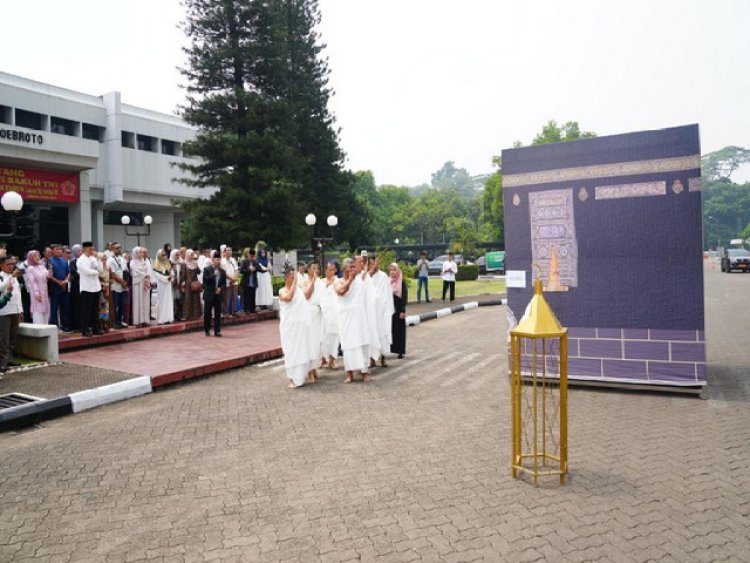 Puspen TNI | Kepala Pusat Pembinaan Mental (Kapusbintal) TNI sebagai Badan Koordinasi Urusan Haji Tentara Nasional Indonesia (Bakuh TNI) Laksma TNI Drs. Ian Heriyawan, CHRMP memimpin upacara Manasik Haji TNI Visa Athan Saudi Arabia Tahun 1444 H / 2023 M sebanyak 126 orang, bertempat di Aula Gatot Soebroto Mabes TNI, Cilangkap, Jakarta Timur, Sabtu (20/5/2023).