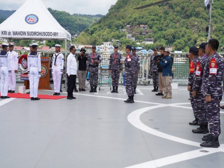 Puspen TNI | Menteri Koordinator Bidang Politik, Hukum, dan Keamanan RI (Menkopolhukam RI) Prof. Dr. Mohammad Mahfud MD, S.H., S.U., M.I.P., didampingi Pangkoarmada II Laksda TNI Maman Firmansyah, mengunjungi kapal rumah sakit KRI dr. Wahidin Sudirohusodo-991 (WSH-991) di Labuan Bajo, NTT, Senin (8/5/2023).