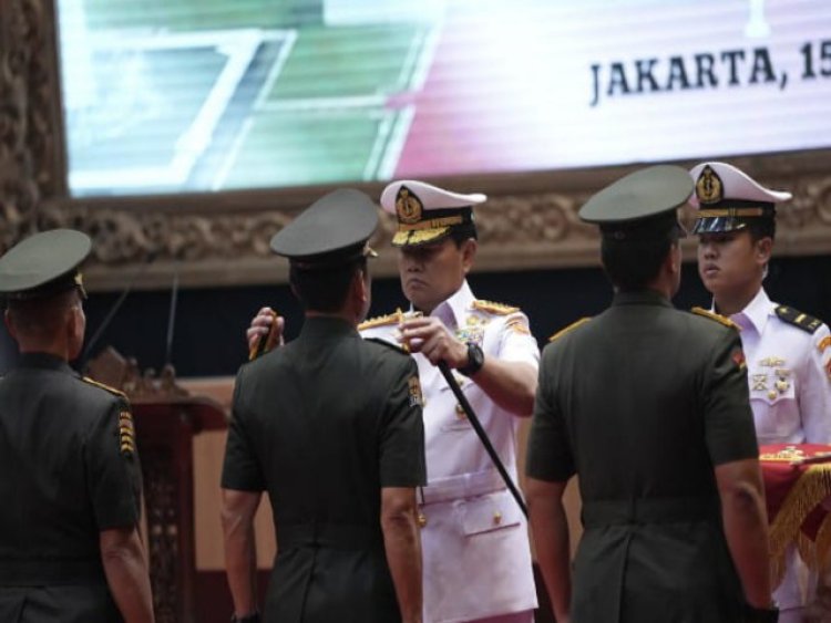Jakarta - Puspen TNI | Panglima TNI Laksamana TNI Yudo Margono, S.E., M.M., usai memimpin acara serah terima jabatan yang dihadiri oleh pejabat utama Mabes TNI dan para pejabat yang melaksanakan serah terima jabatan, bertempat di Aula Gatot Soebroto, Mabes TNI Cilangkap Jakarta Timur, Senin (15/5/2023) menyampaikan bahwa selama TNI kuat negara tidak akan goyah.