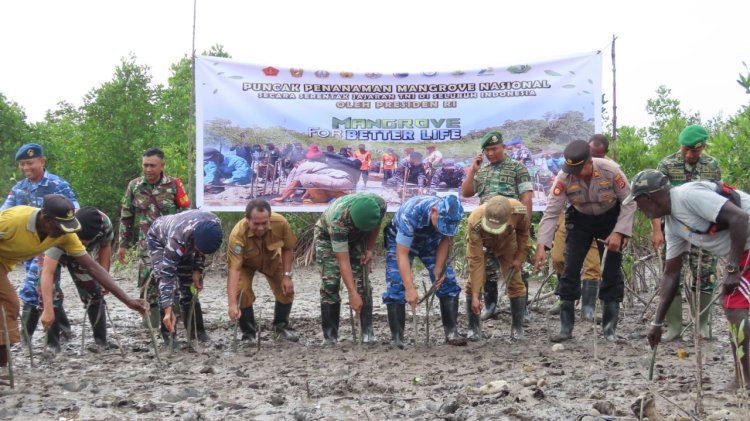 Peduli Dengan Kelestarian Alam Serta Cegah Abrasi, Kodim 1710/Mimika Bersama Satuan TNI-Polri Gelar Penanaman Mangrove