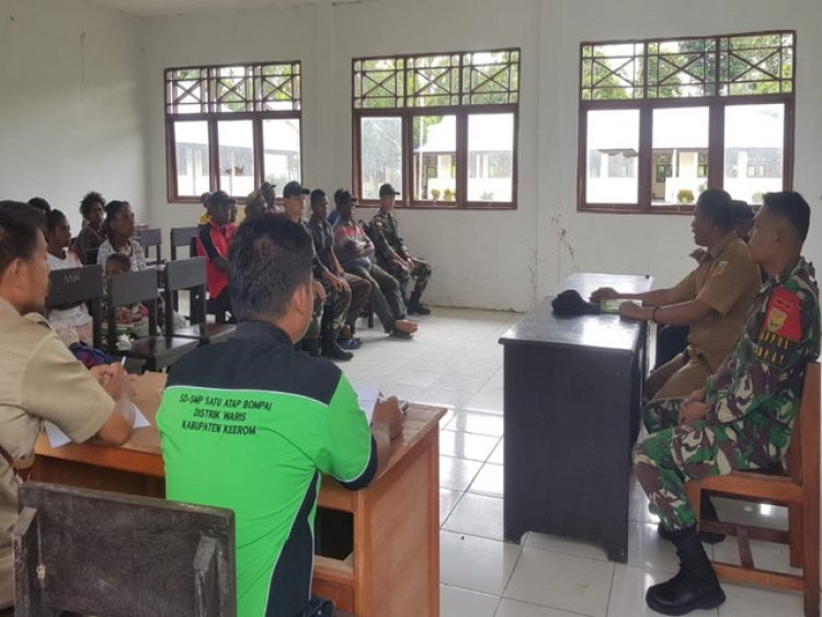 Keerom | Para prajurit TNI dari Satgas Yonif 143/TWEJ hadiri undangan pihak sekolah untuk mengikuti rapat menyusun kebijakan dan strategi guna meningkatkan kualitas pendidikan di SMPN Bompay, Kampung Bompay, Distrik Waris, Kabupaten Keerom - Papua, Selasa (16/05/2023).